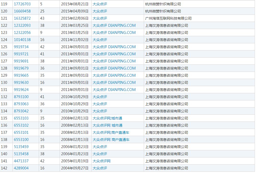 2004年,注冊(cè)了“大眾點(diǎn)評(píng)”16類的商標(biāo)。